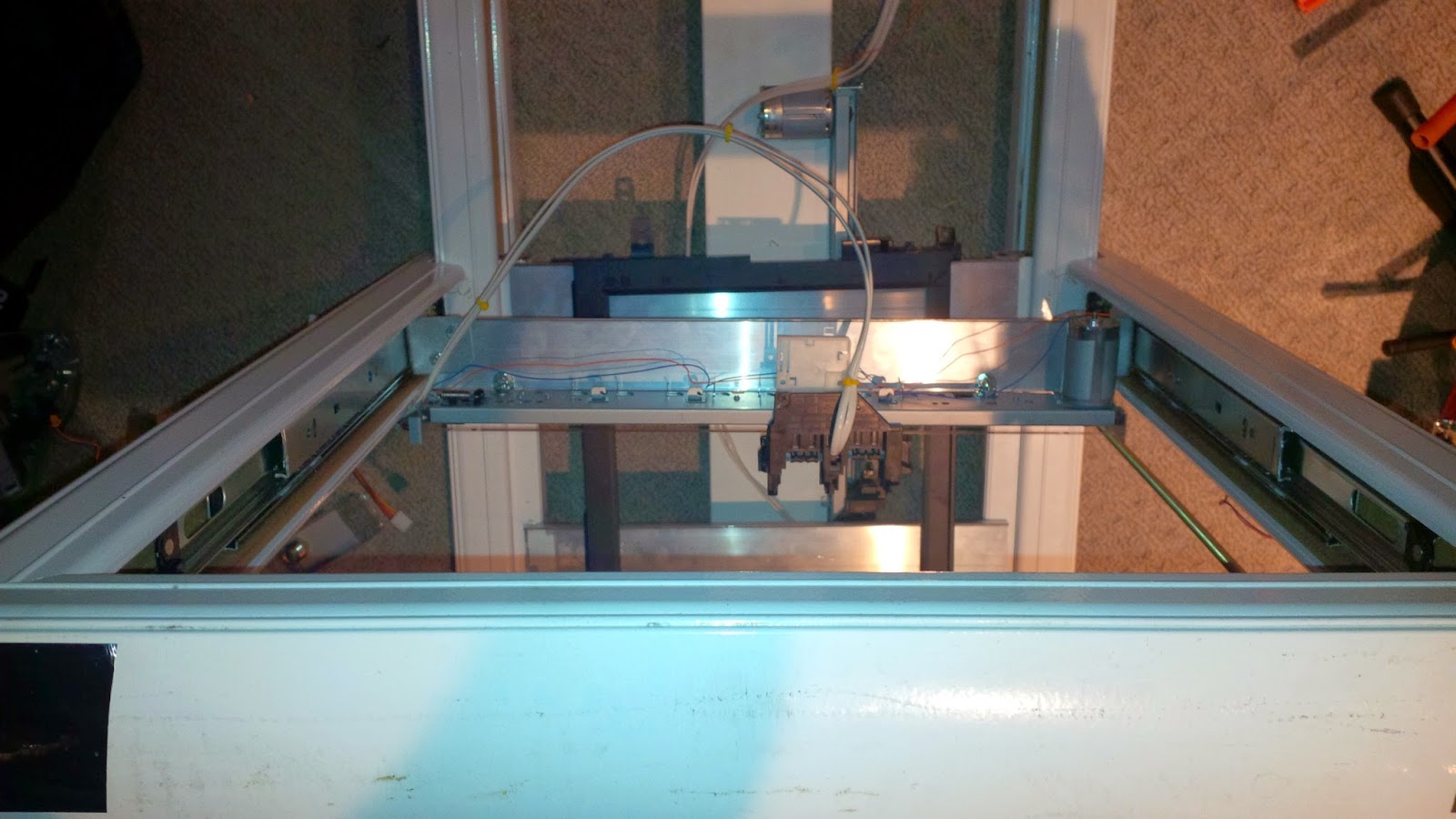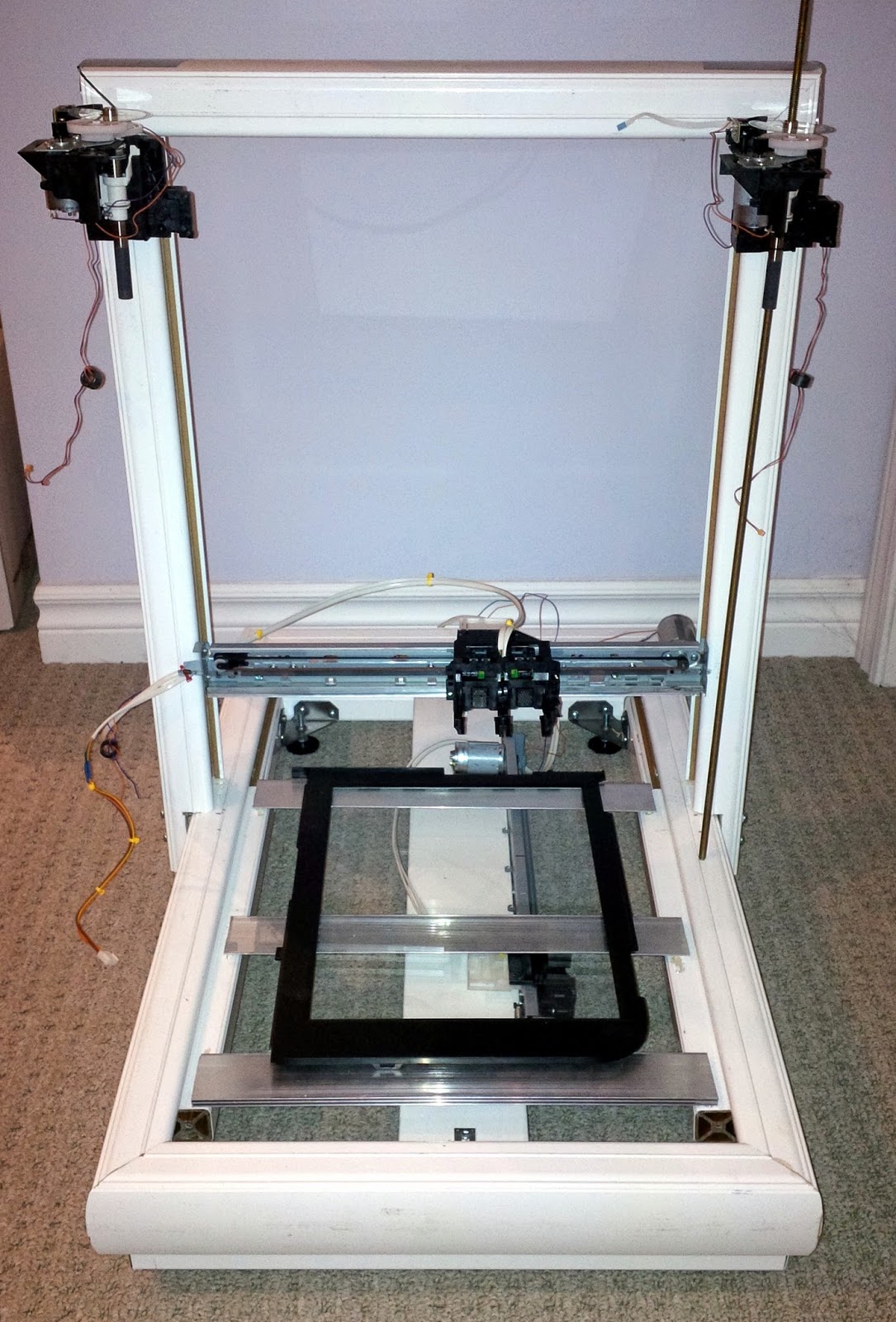 The Y-Axis bed is the glass top of the all-in-one printer's scanner. The aluminum cross bars come from the bottom track of a sliding closet door.