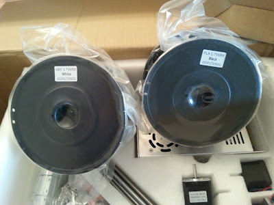 All of the frame components are cut out of clear acrylic. (With a nice pink protective layer... hmmm... should I leave that on? )Also included were two 1kg spools of 1.75mm PLA to get me started.